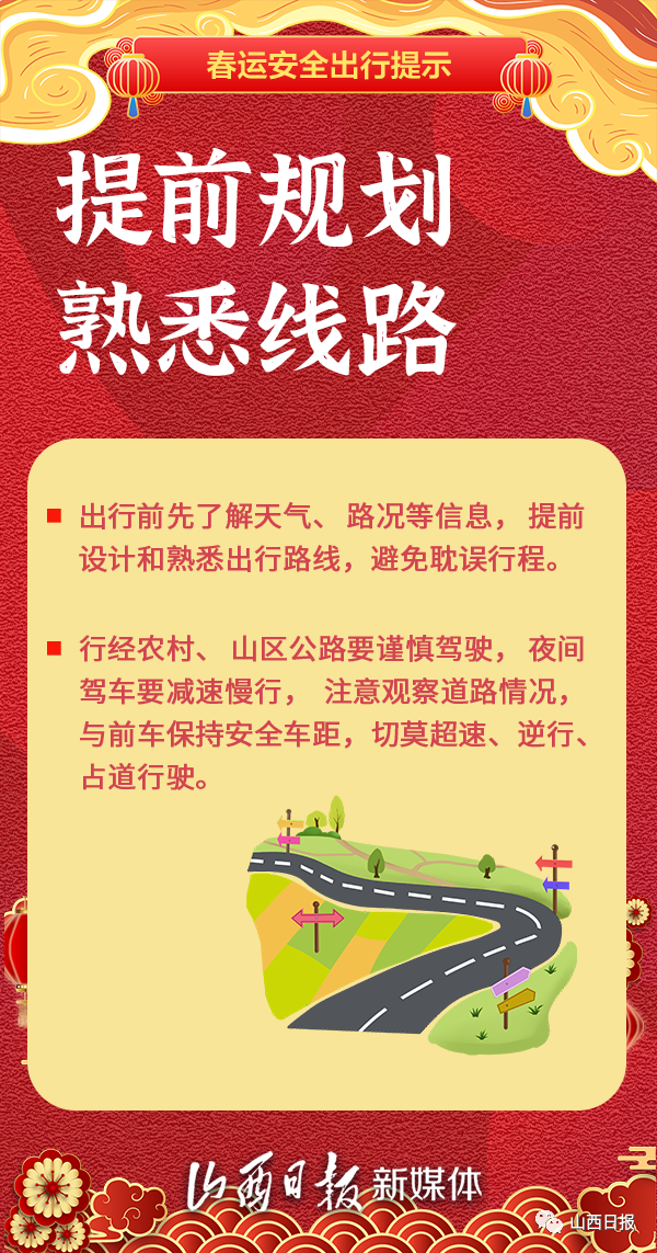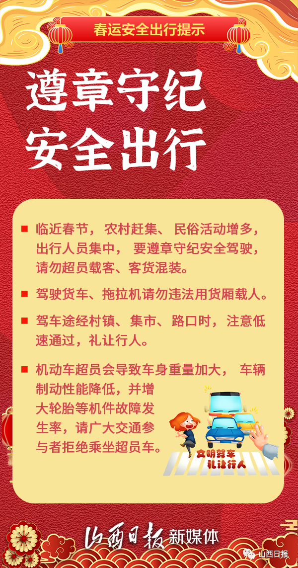 2022年春运时间为1月17日至2月25日结束,为期40天。为确保春运期间道路交通安全畅通,山西省公安厅交管局发布春运期间交通安全出行提示,提醒驾乘人员,提前熟悉路况,遵守交通规则,安全文明出行。