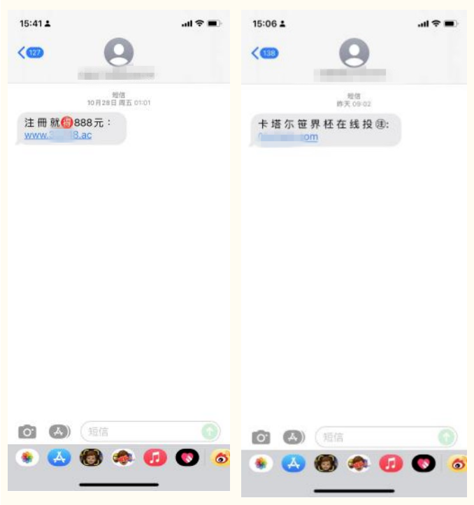 “xxx网站在线投注”“注册就得888元”,大家可能都收到过此类的短信,千万不要抱着一夜暴富的想法去点击,短信中链接或是直接隐藏了恶意代码或病毒,或是要求填写详细的个人信息,有时则直接要求支付一定的会员费用来骗取金钱。