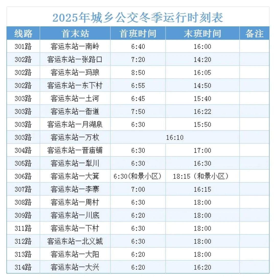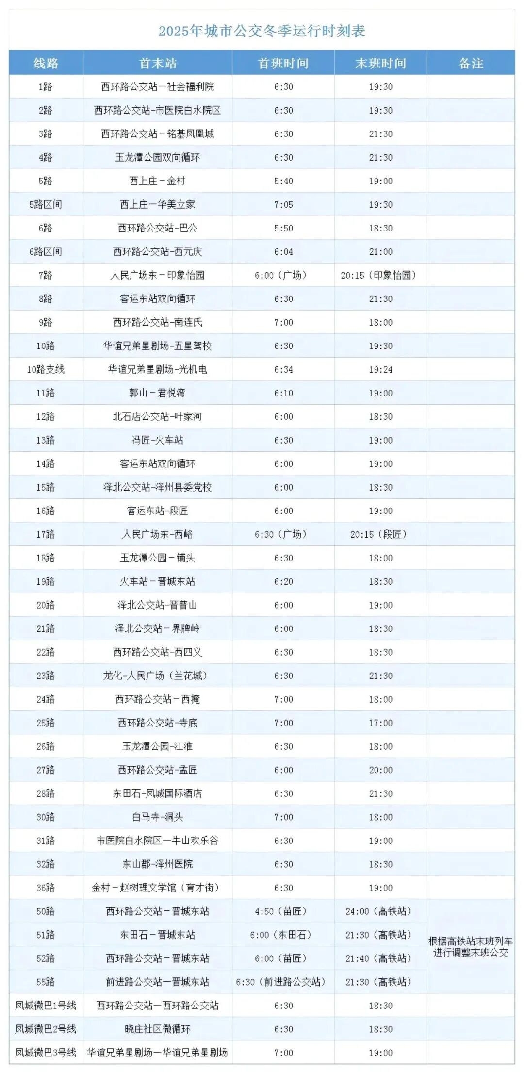 根据季节变化以及乘客出行情况,市公交公司将于2025年10月21日起,城市、城乡公交执行冬季运行计划,城际、旅游公交运行计划不变,请大家相互转告。如有疑问请拨打城市公交热线:0356-2025980、城乡公交热线:0356—2036625;查询“车来了”APP或“车来了”微信小程序。具体时刻如下: