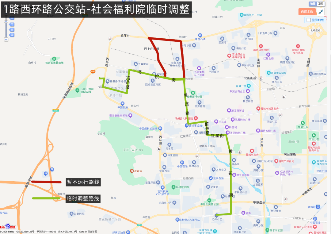 根据晋城市公安局交通管理支队、晋城国投智慧产业发展有限公司发布的《关于对北环路部分路段进行施工的通告》,因凤城智慧颐养园(一期)园区道路工程总承包项目施工,于2025年11月1日至2027年8月31日对屋厦立交施工区域、景忠路跨线桥施工区域、东河人行通道及箱涵施工区域、书院河人行通道及箱涵施工区域、景西路下穿通道施工区域、西河人行通道及箱涵施工区域、晋韩路下穿通道施工区域等进行封闭施工,封闭施工期间,过往社会车辆禁止驶入。受此影响,在道路封闭期间,将临时调整1路和11路绕行,具体为: