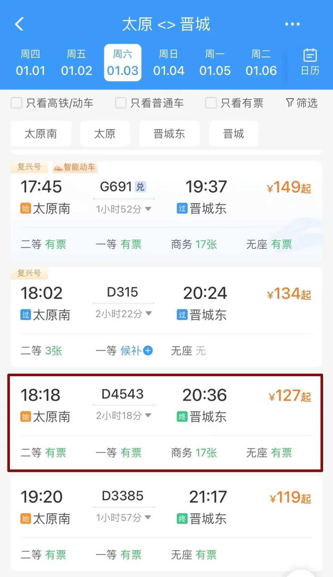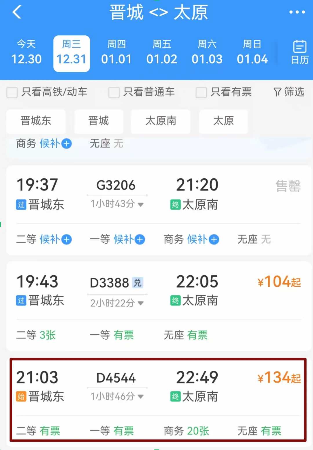 12月31日、1月3日高铁晋城东站增开往返太原的夜间临客。