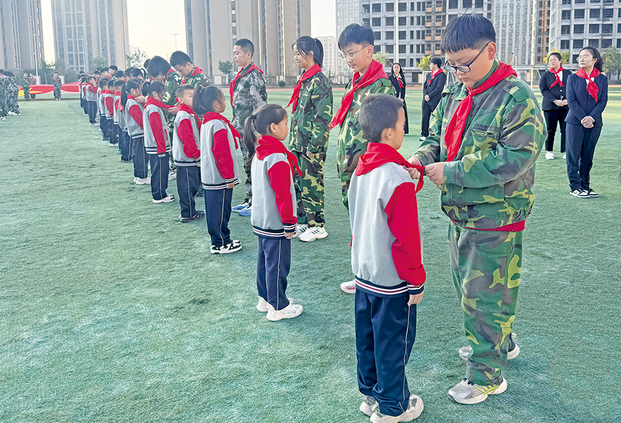 活动在庄严的升旗仪式中拉开序幕。护旗手护卫少先队队旗入场,全体少先队员高唱《中国少年先锋队队歌》,展现出昂扬向上的精神风貌。仪式上,举行了珍藏小号红领巾、佩戴大号红领巾仪式,随后进行了授中队旗、为新建中队辅导员颁发聘书等环节。老队员为新队员佩戴上崭新红领巾,新老队员互敬队礼。党旗、团旗、队旗三面旗帜的传递,将红色基因传承具象化。新队员在队旗下庄严宣誓,铿锵誓言表达了听党话、跟党走,为强国建设、民族复兴而奋斗的坚定决心。(刘茜茜 董沁亮)