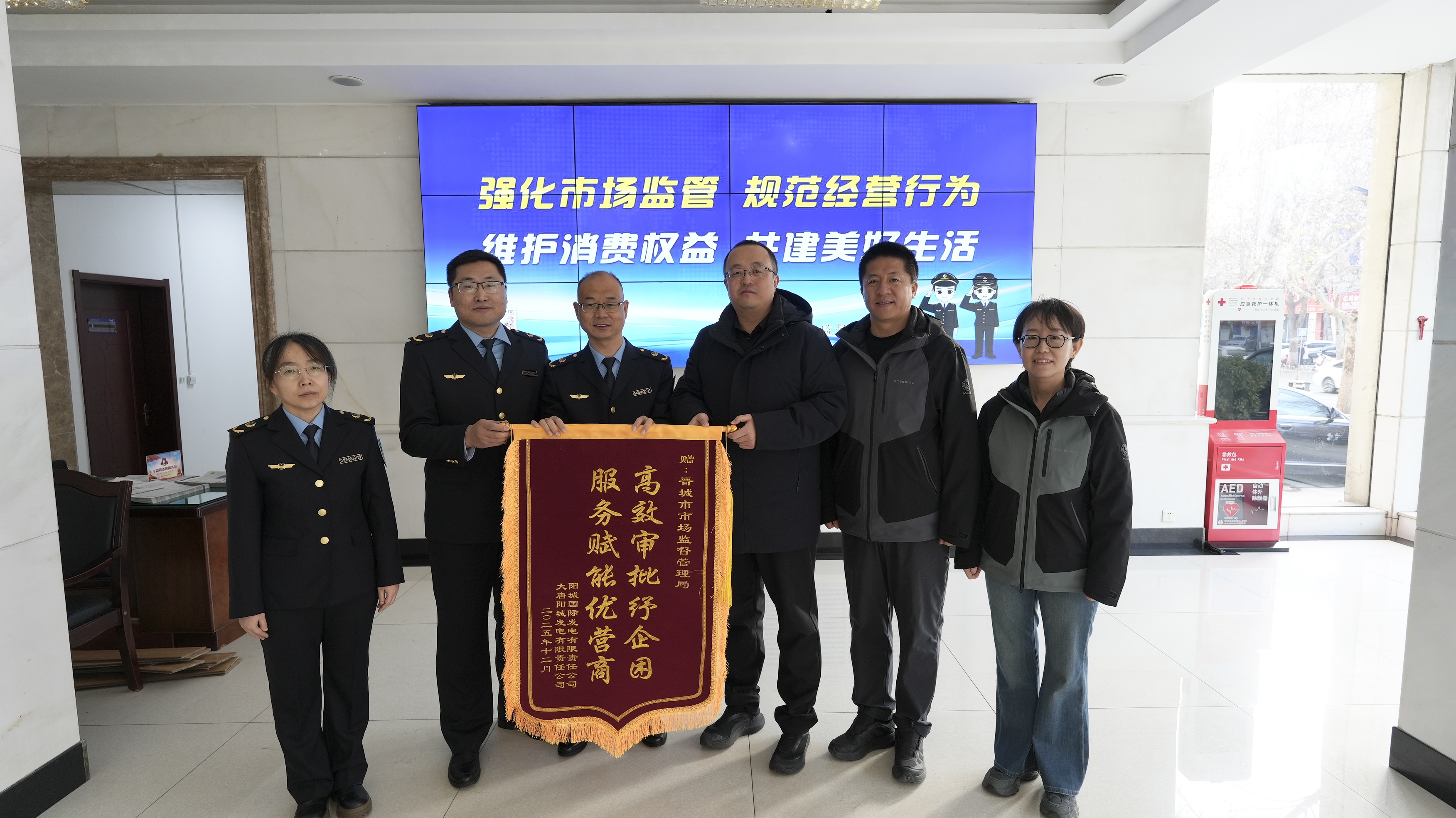 12月26日上午,阳城国际发电有限责任公司一行三人将一面锦旗送到了晋城市市场监督管理局三级调研员王进军手中,对市局的高效服务和暖心帮办表示诚挚谢意。“高效审批纾企困 服务赋能优营商”十四个字,不仅承载着企业的由衷认可,更生动诠释了市局优化营商环境、助力市场主体发展的务实举措。