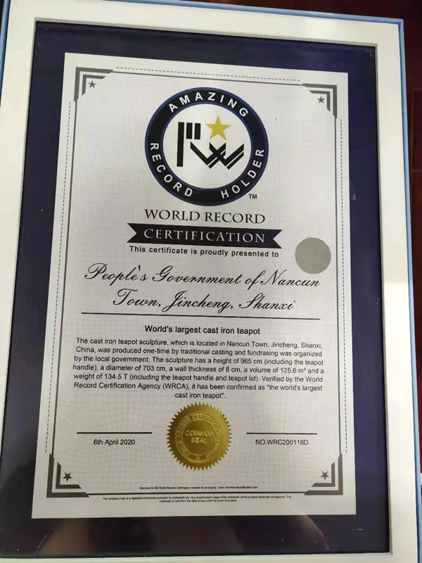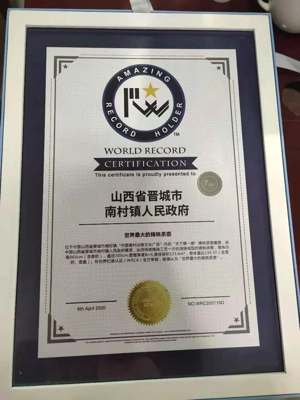 “世界最大的铸铁茶壶”通过世界纪录认证