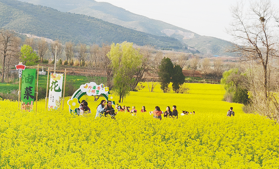 近日,城区西上庄街道山西底村连片油菜花竞相绽放,吸引了众多游客前来观赏。本报记者 李秀娟 摄