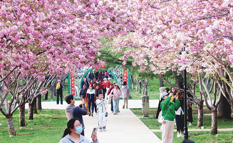 4月13日,市民在泽州公园观赏樱花。连日来,我市各公园、广场、街道的樱花次第绽放,美不胜收。刘群力 摄