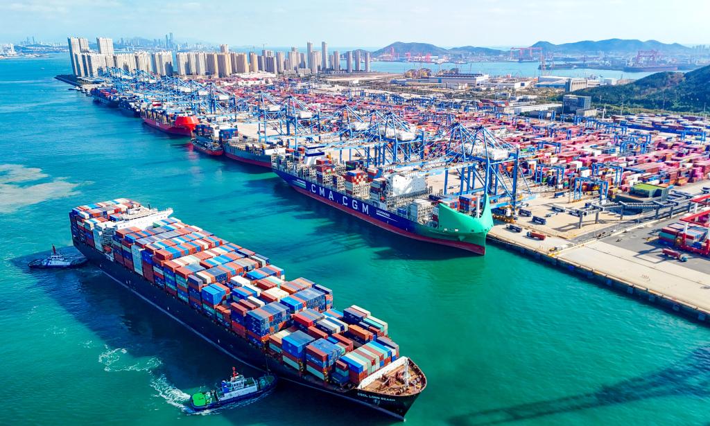 2025年11月5日,一艘货轮满载货物驶出青岛自贸片区(无人机照片)。新华社发(张进刚摄)