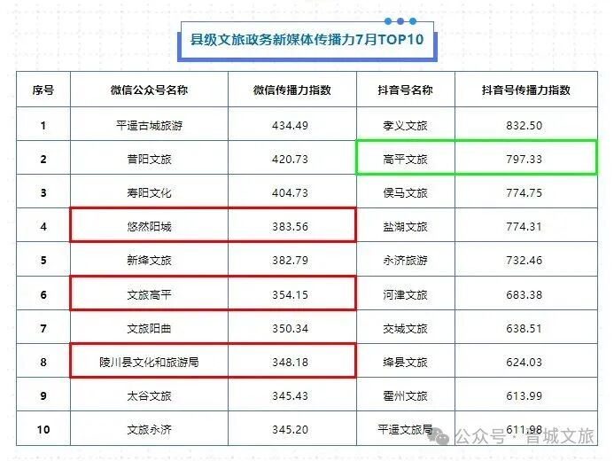 微信公众号“悠然阳城”“文旅高平”“陵川县文化和旅游局”均冲进全省县级榜单前10,分别位列第4、第6、第8,上榜总数居全省第一,同时,抖音号“高平文旅”以797.33的指数高分位列全省县级榜单第二。