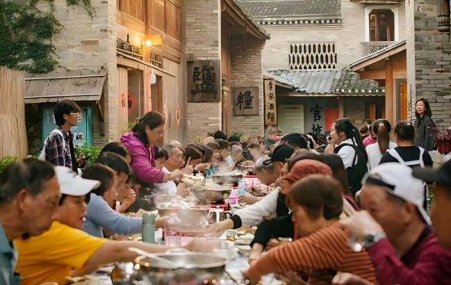 贯利巷里,丰收长桌宴,共同品尝当地特色宴席——“十大碗”。