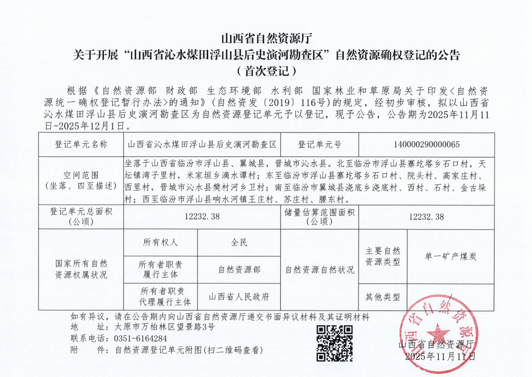 山西省自然资源厅关于开展“山西省沁水煤田浮山县后史演河勘查区”自然资源确权登记的公告(首次登记)