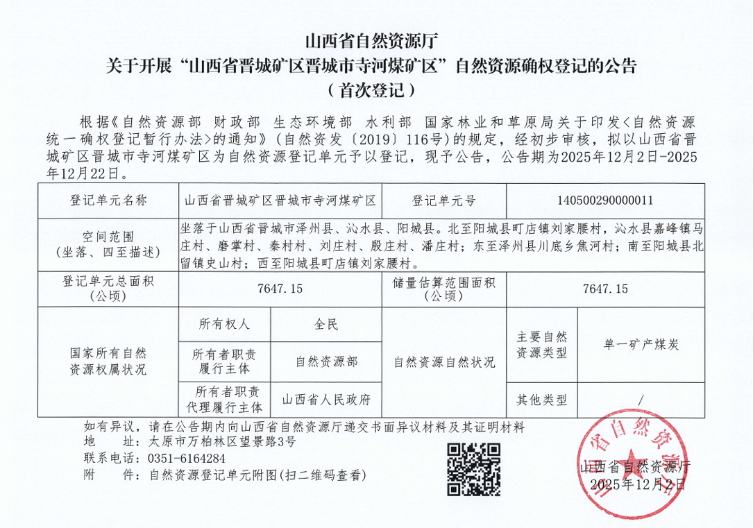 山西省自然资源厅关于开展“山西省晋城矿区晋城市寺河煤矿区”自然资源确权登记的公告(首次登记)